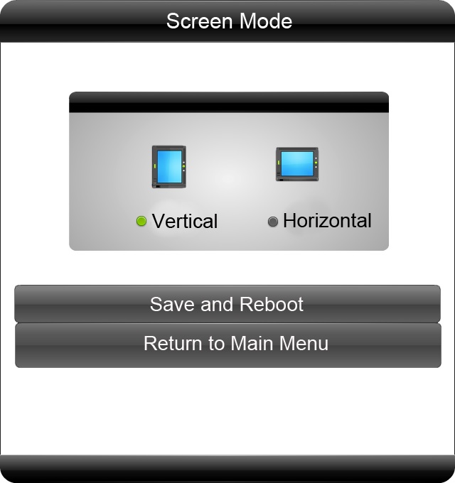 1 of 3 If your screen is playing content begin by pressing "Stop" on your remote control, this should take you back to the "Home" screen. Now press "Setup" on your remote and navigate down to "Screen Mode" and press "Play" on your remote. From here you can select the correct orientation for your screen. Do so by using the left or right button on your remote then highlight "Save and Reboot" and press "Play" on your remote.